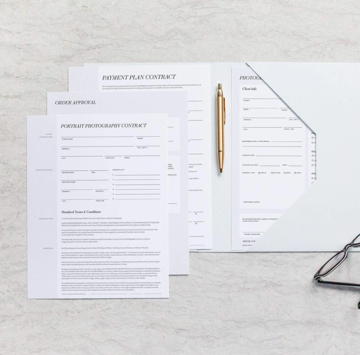 All documents are uniformly professional, beautiful, and designed for print or paperless use (with instructions included). Save big on the full bundle or order a la carte on everything you need to support your successful studio with style and ease.