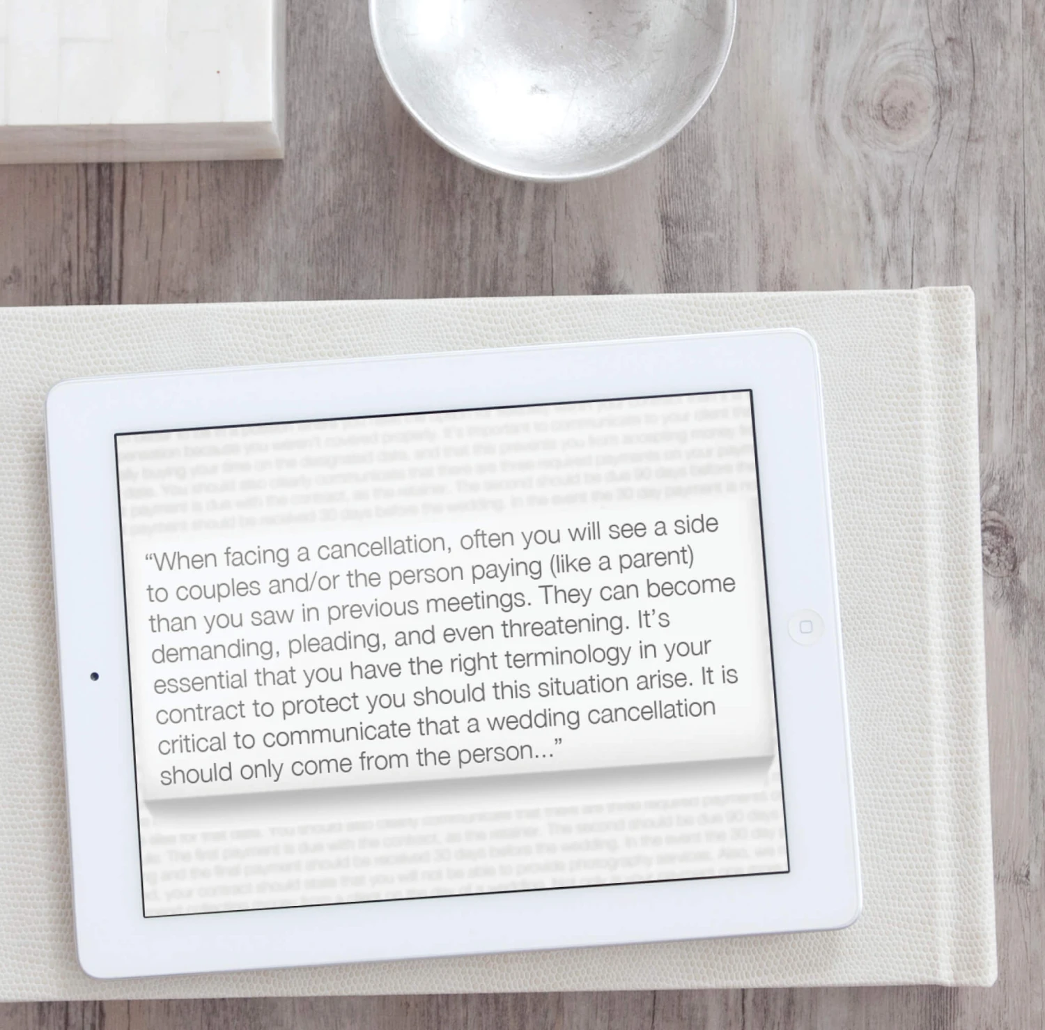 Possibly the single most valuable resource for any Wedding Photographer, our Essential Wedding Studio Policies for Success is a comprehensive guide to the implementation of policies and client relations. Elevate your business practices, create a superior impression for your customers and solidify a foundation for the utmost success in your craft.